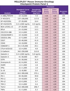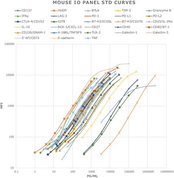 Immune checkpoint proteins are key regulators of the immune system and drug targets of cancer immunotherapy. Immune checkpoint molecules have been found on the cell surface of immune cells and tumor cells as activating receptors or inhibitory receptors. Immune checkpoint inhibitors, such as blocking antibodies to cytotoxic T lymphocyte-associated antigen-4 (CTLA-4), programmed cell death protein-1 (PD-1) and programmed cell death ligand 1 (PD-L1), have demonstrated significant efficacy in the treatment of a variety of cancers. Recent studies have also shown many immune checkpoint proteins can undergo alternative splicing or proteolytic cleavage to produce soluble checkpoint proteins. The expression levels of soluble and cell-surface immune checkpoint proteins in the circulation and in tumor-microenvironment (TME) may be used as putative immune-based biomarkers for cancer research and biomarker discovery in immunological diseases. MILLIPLEX® Mouse Immuno-Oncology Checkpoint Protein Panel 1 is a 28-plex kit to be used for the simultaneous quantification of any or all of the following analytes in serum, plasma, cell culture supernatant, cell lysate, and tissue/tumor extract samples: 4-1BBL/TNFSF9, 5′-NT/CD73, B7-H2/ICOSL, B7-H3/CD276, BCA-1/CXCL-13, BTLA, CD137/4-1BB, CD226/DNAM-1, CD25/IL-2Rα, CD27, CD40, CD80/B7-1, CTLA-4/CD152, E-cadherin, Galectin-1, Galectin-3, GITR, Granzyme B, HVEM, IFNγ, IL-10, LAG-3, PD-1, PD-L1, PD-L2, TIM-3, TLR-2, and TNFα. Panel Type: MAGNETIC Circulating Cancer